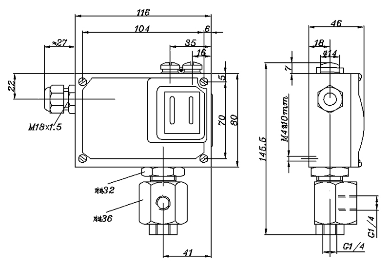 504/7D壓力開(kāi)關(guān)外形尺寸及安裝尺寸(單位:mm)